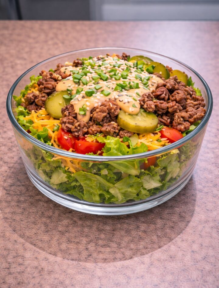 If you love the flavors of a classic burger but want something a little lighter and more balanced, these Big Mac protein bowls are a great option. They capture the familiar taste of a burger with seasoned beef, crisp lettuce, pickles, cheese, and a creamy special sauce, all served in a convenient bowl instead of a bun.